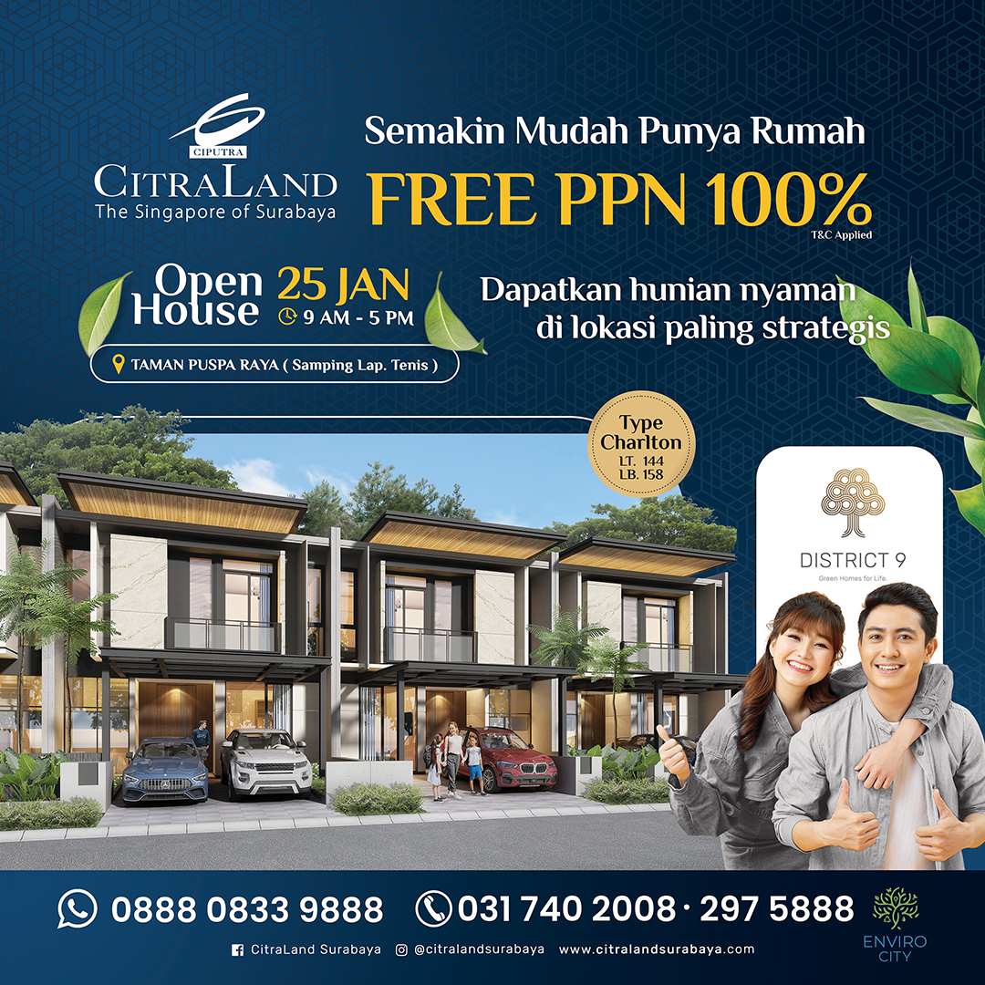 Hunian modern di kawasan perumahan elit Surabaya Barat kini semakin terjangkau. Nikmati kesempatan memiliki rumah di lingkungan premium dengan lokasi strategis, fasilitas lengkap, dan promo terbatas FREE PPN 100%!
